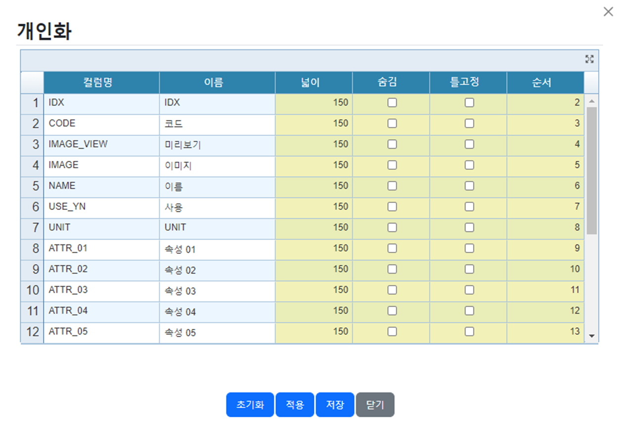 위 개인화 팝업의 경우 넓이, 숨김 여부, 틀고정여부, 순서를 설정하고 저장 할 수 있습니다.