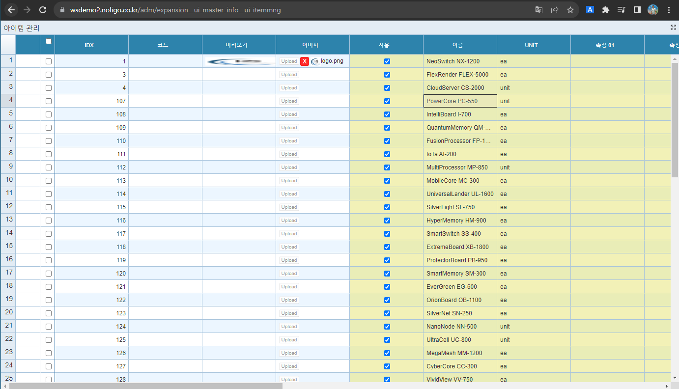 6. 엑셀 업로드 : 업로드 버튼 클릭 시 그리드에 대상 데이터가 표현되고 저장 버튼 클릭 시 저장이 됩니다.