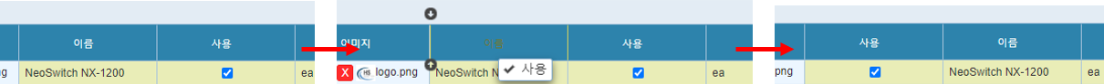 위 개인화 팝업의 경우 넓이, 숨김 여부, 틀고정여부, 순서를 설정하고 저장 할 수 있습니다.