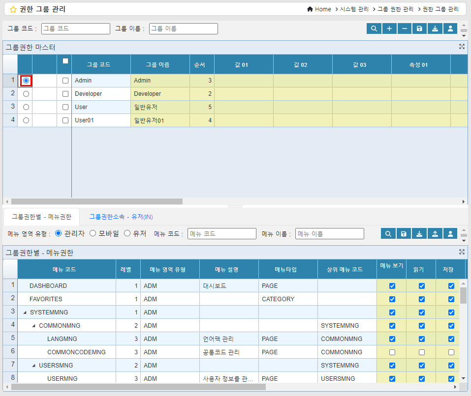 그룹권한 마스터 그리드에 그룹을 추가/수정/삭제가 가능합니다.