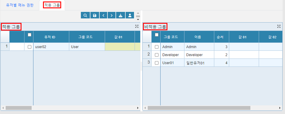 유저별 메뉴권한 옆에 적용 그룹 그룹이라는 탭이 있는데요. 클릭해 보시면 아래와 같이 보이실 겁니다.